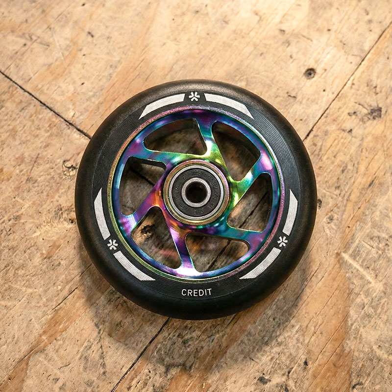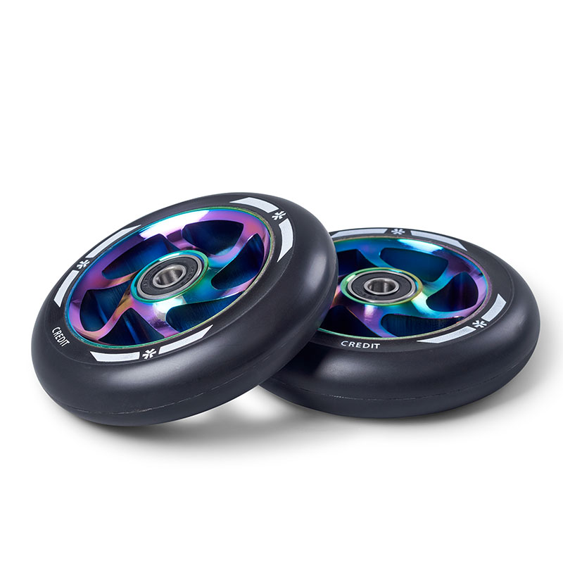 Union Credit V2 scooter wheels. Classic and strong wheel design with stylish curved spokes. These wheels are designed to last long  This wheel weight is respectable 214 grams per wheel. These wheels will give you more controlled ride and greater shock absorption. Equipped with smooth rolling ABEC9 bearings for quite and fast roll!